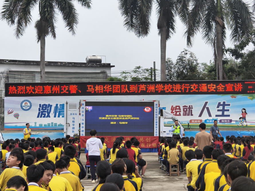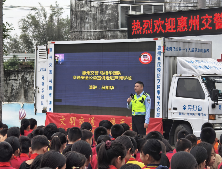 4月28日,惠州市公安局交警支队江东大队联合马相华交通公益团队,走进芦洲学校开展“知危险会避险”交通安全宣传活动。